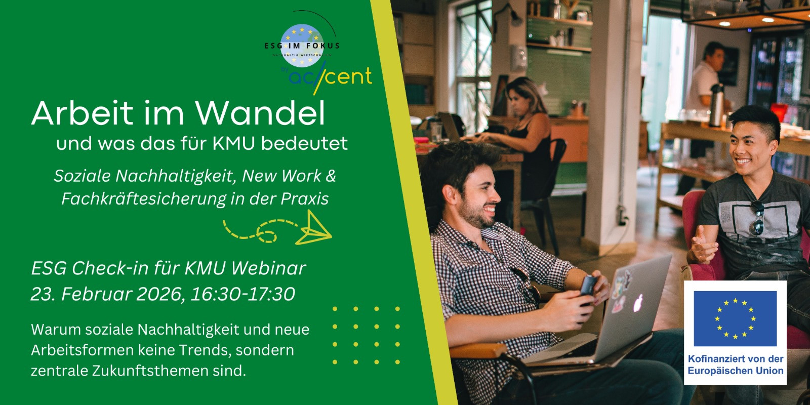 accent Inkubator GmbH wurde vom Land Niederösterreich mit der Durchführung des Projekts „ESG im Fokus“ beauftragt, welches accent in Zusammenarbeit mit anderen niederösterreichischen Organisationen (ecoplus, WKNÖ, u.a.) bis Ende 2026 umsetzt. Die EU ko-finanziert dieses Projekt mit Mitteln aus dem EFRE-JTF Fonds.