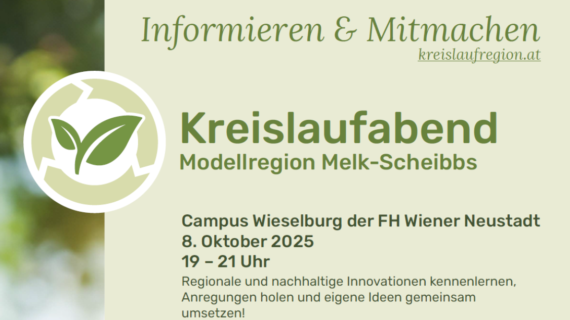 Am 8. Oktober 2025 findet von 19–21 Uhr findet am Campus Wieselburg der Kreislaufabend der Modellregion Melk-Scheibbs statt. Vorgestellt werden regionale und nachhaltige Projekte sowie Unternehmensinitiativen.