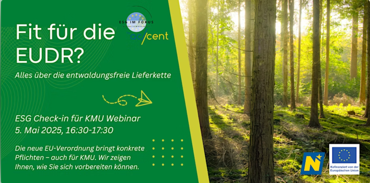 Bei dem Event handelt es sich um den dritten Termin der monatlichen Webinarreihe „ESG-Check-in für KMU“ im Rahmen des Projekts ESG im Fokus, durchgeführt von accent und gefördert durch das Land NÖ und die Europäische Union im Programm IBW/EFRE- & JTF.