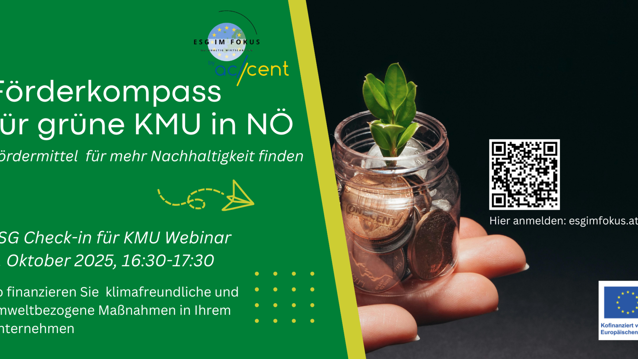 Nachhaltigkeit zahlt sich aus – besonders, wenn Sie wissen, welche Fördermittel Sie als KMU in Niederösterreich nutzen können. Dieses einstündige Webinar liefert einen kompakten und praxisnahen Überblick über aktuelle Förderprogramme im Klima-, Umwelt- und Energiebereich, die speziell auf die Bedürfnisse kleiner und mittlerer Unternehmen zugeschnitten sind.