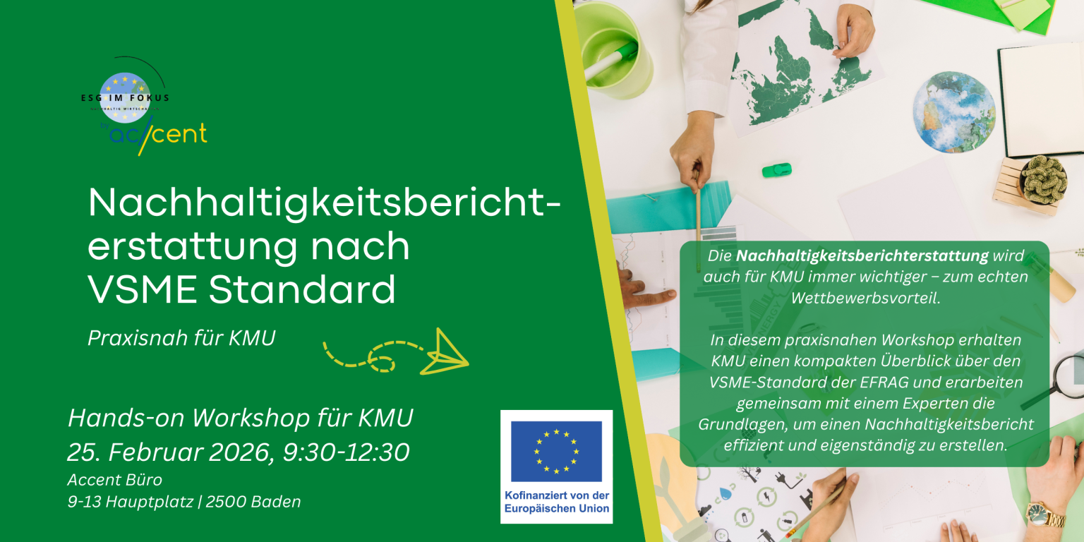 Dieser 3-stündige Praxis-Workshop richtet sich gezielt an KMU, die Nachhaltigkeit strategisch nutzen und sich zukunftsfit aufstellen wollen. Im Fokus steht der VSME-Standard der EFRAG – ein freiwilliger, praxisnaher Nachhaltigkeitsberichtsstandard, der speziell für KMU entwickelt wurde und in der Omnibus-Verordnung nun allen Unternehmen bis 1.000 Mitarbeitenden empfohlen wird.