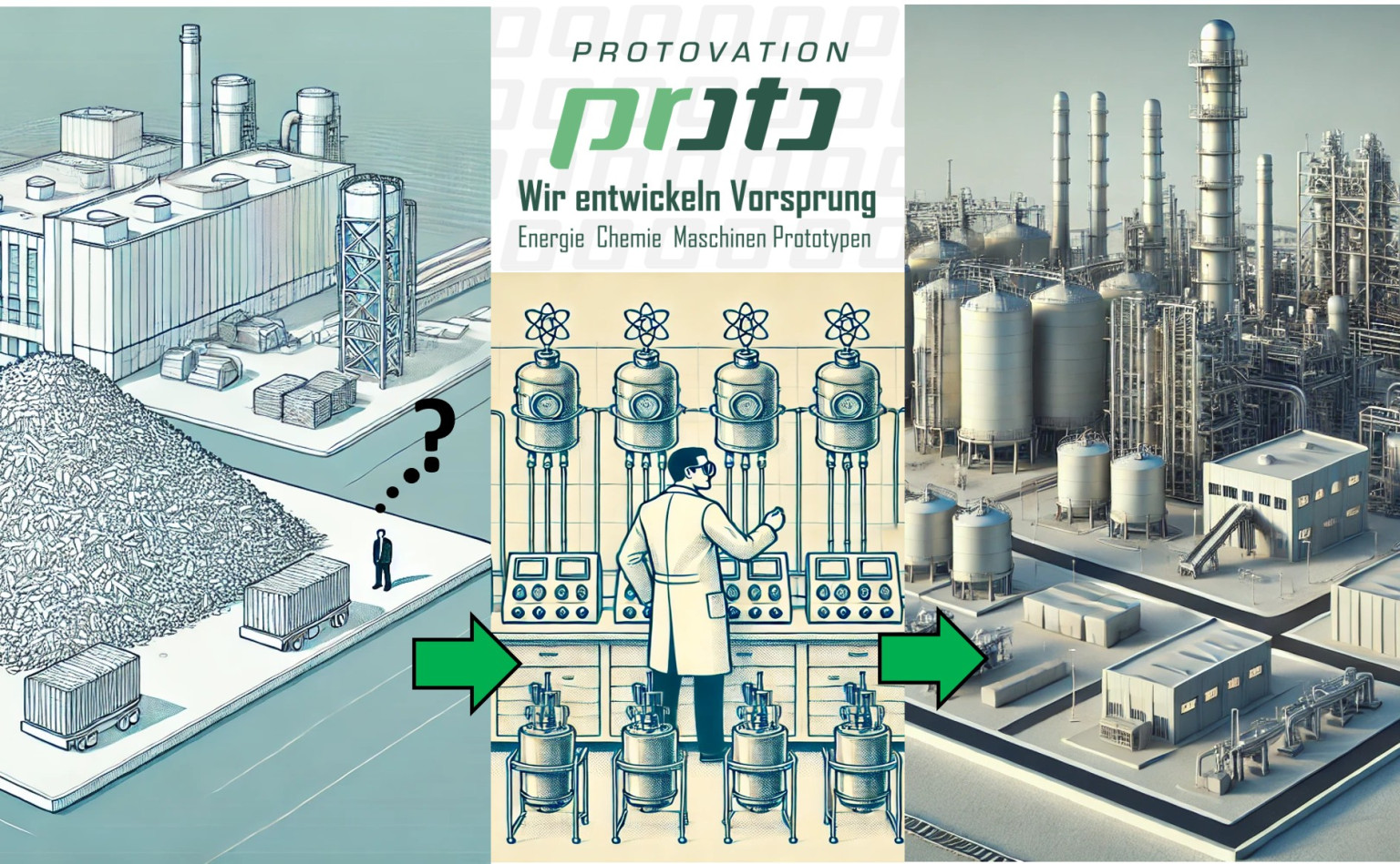 Die gesammelten Erfahrungen aus diesen Entwicklungen setzt Protovation gemeinsam mit seinem Partner im eigenen Interesse ein, um in Form einer Prozesskette chemischer Reaktionen aus Zelluloseabfällen reine Basischemikalien für die chemische Industrie herzustellen. Dieses Mammutprojekt treibt uns an.